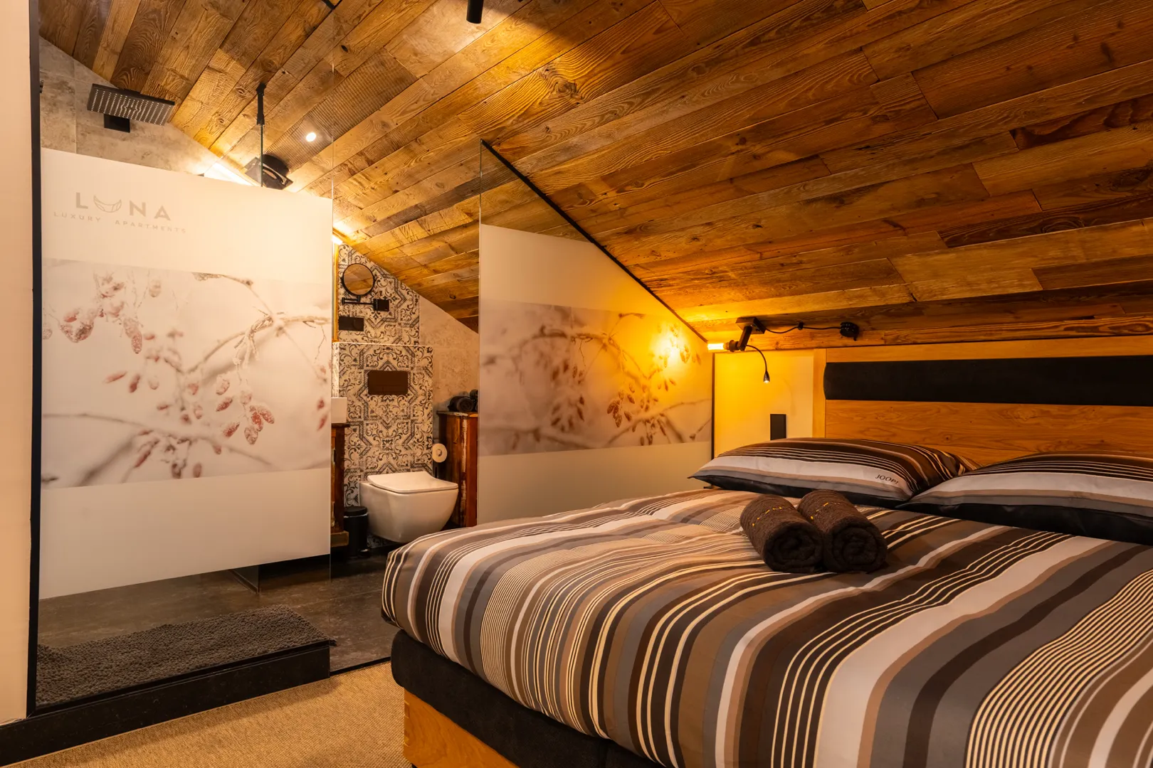 45m2- apartament dwuosobowy na pierwszym piętrze. Sypialnia z łazienką.